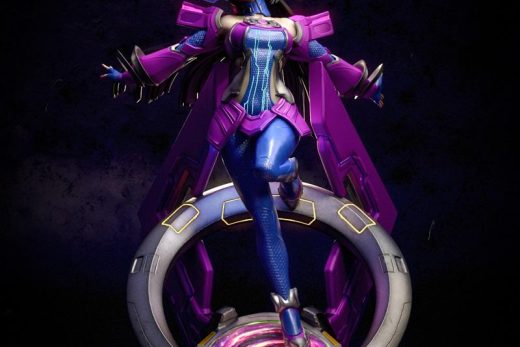 The bust is presented on an elaborate Art Deco-style base, evoking the film’s classic aesthetic. The background depicts a stylized cityscape at sunset, with dramatic clouds and exhaust plumes from the jetpack adding to the dynamic scene. This collectible piece is perfect for fans of retro-futuristic heroes and vintage comic book art.