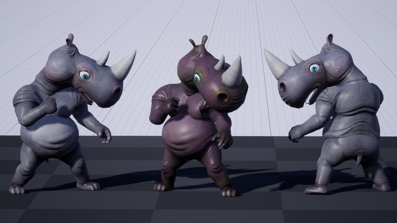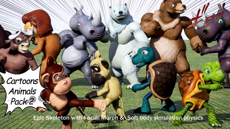 Cartoons Animals Pack 2: consists of 6 types of animals as humanoid rigged characters. There is a bear, bull, monkey, tortoise, lion, & rhinoceros (2 colors for each animal). Total of 12 animals in variations.
