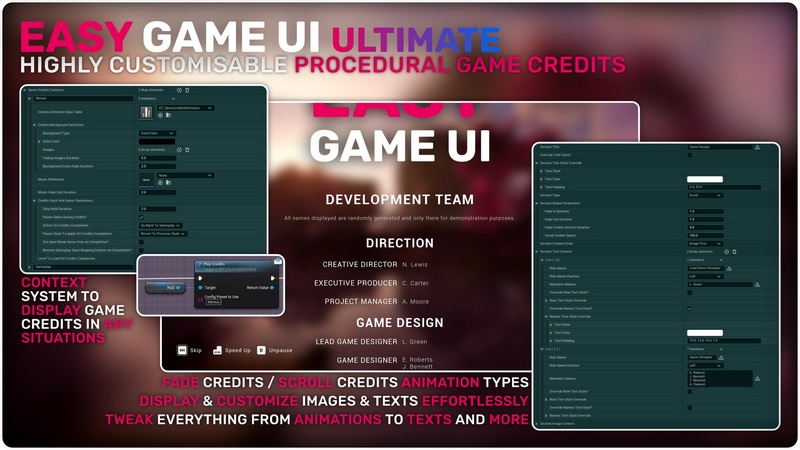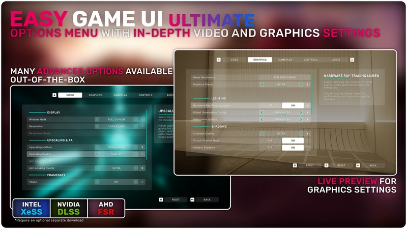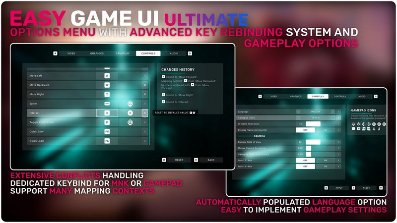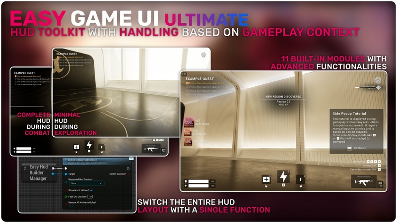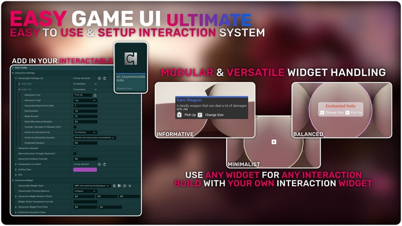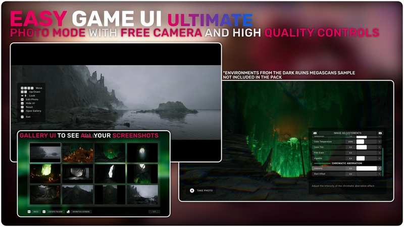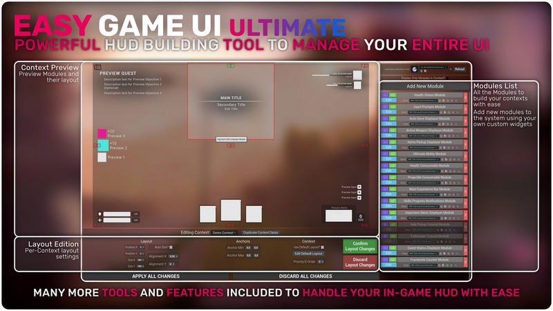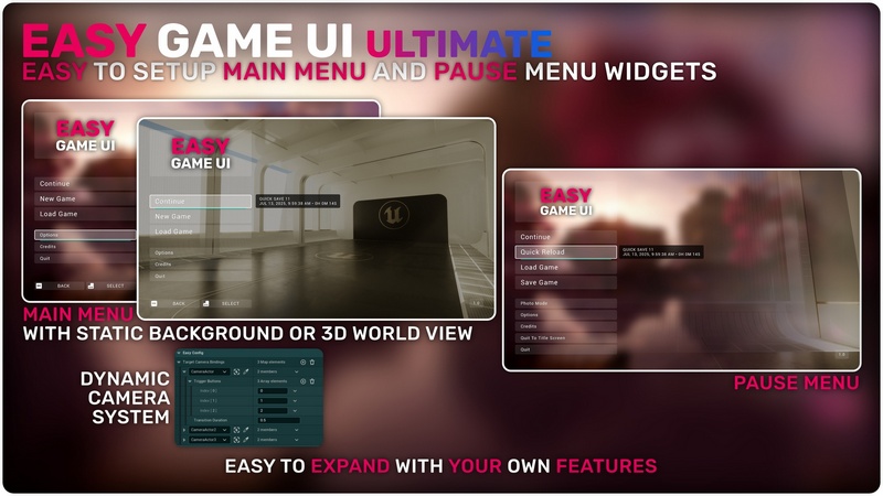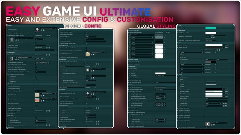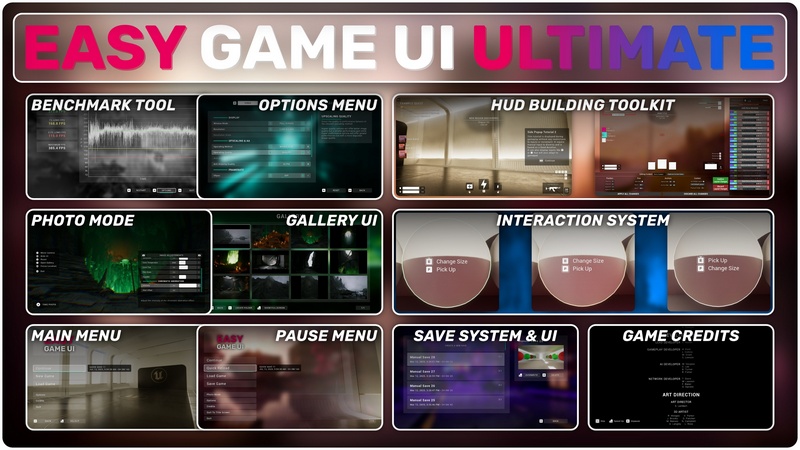 Easy Game UI Ultimate is a quick and simple way to add a complete UI Framework to your game with everything you need and more! This includes a main menu, pause menu, an options menu, an advanced save game system, a photo mode and more unique features such as a game benchmarking tool and a procedural game credits system! Alongside those systems, you also get an advanced HUD Building Tool and a feature-packed interaction system!