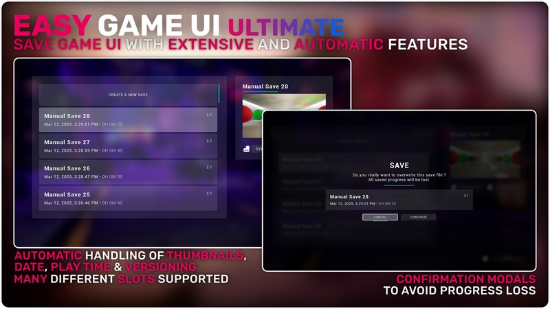 Save Game UI with extensive and automatic features to display many save slots effortlessly in a clean interface