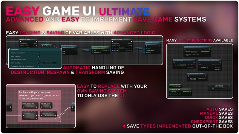 4 types of saves implemented out of the box: Auto Saves, Manual Saves, Quick Saves & Checkpoint Saves