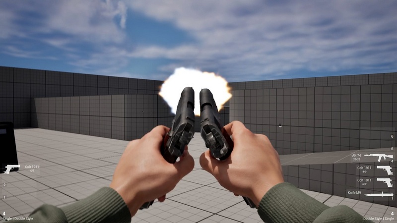 A unique ambidextrous system that allows using two one-handed weapons of different types in any valid combination — including knives, pistols, shields, and (in the future) submachine guns and sawn-off shotguns
