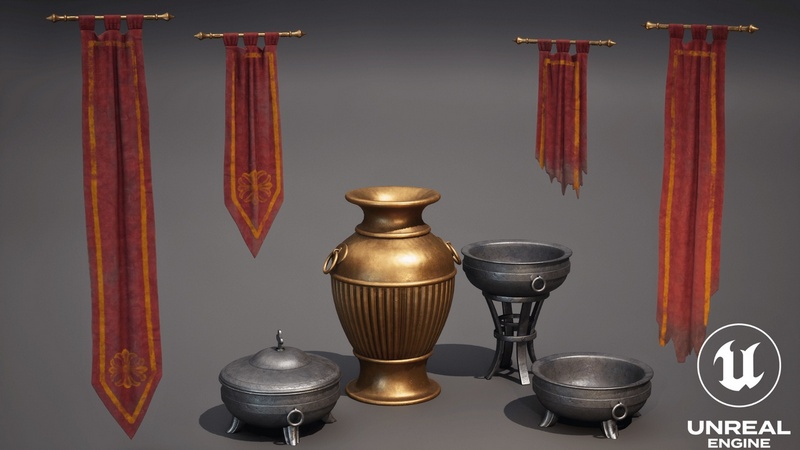 Banners & Tapestries: Elegant red-and-gold medieval banners with realistic cloth physics.