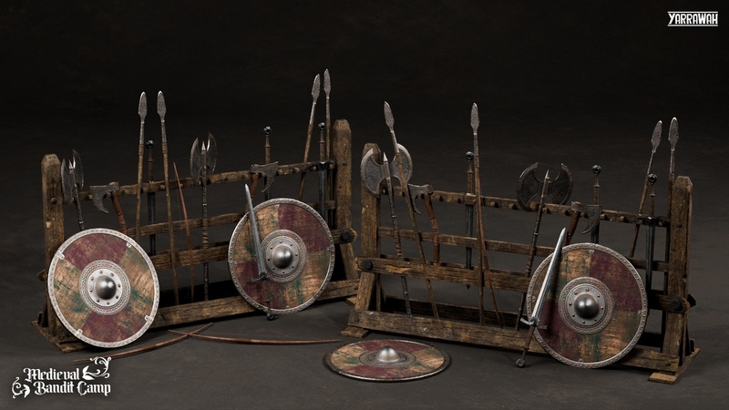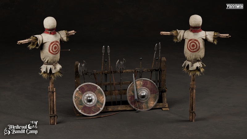 Equip your armories and training grounds with this essential collection of medieval weaponry and equipment. This pack features a sturdy weapon rack fully stocked with a variety of arms, from swords and axes to a bow and spear. A classic training dummy is also included to complete your combat practice scenes.