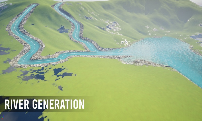 Feature 1: Procedural Level Generation: Automatically generates entire levels, including landscapes, rivers, and meshes, based on predefined rules and data.