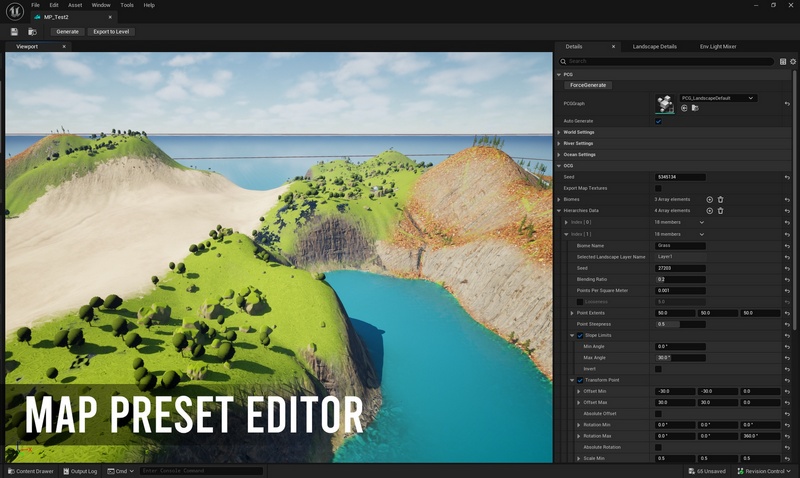 Feature 2: Custom Map Preset Editor: Provides a dedicated asset editor to create, view, and manage MapPreset assets, which control the generation process.