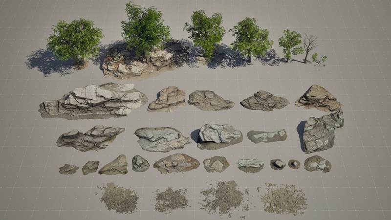 Included are rocks of various sizes, gravel, trees, and small plants. Ideal for creating detailed natural landscapes such as riverbanks and forest floors.