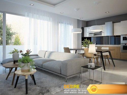 Full Living Room & Kitchen 3d Interior Scene 03