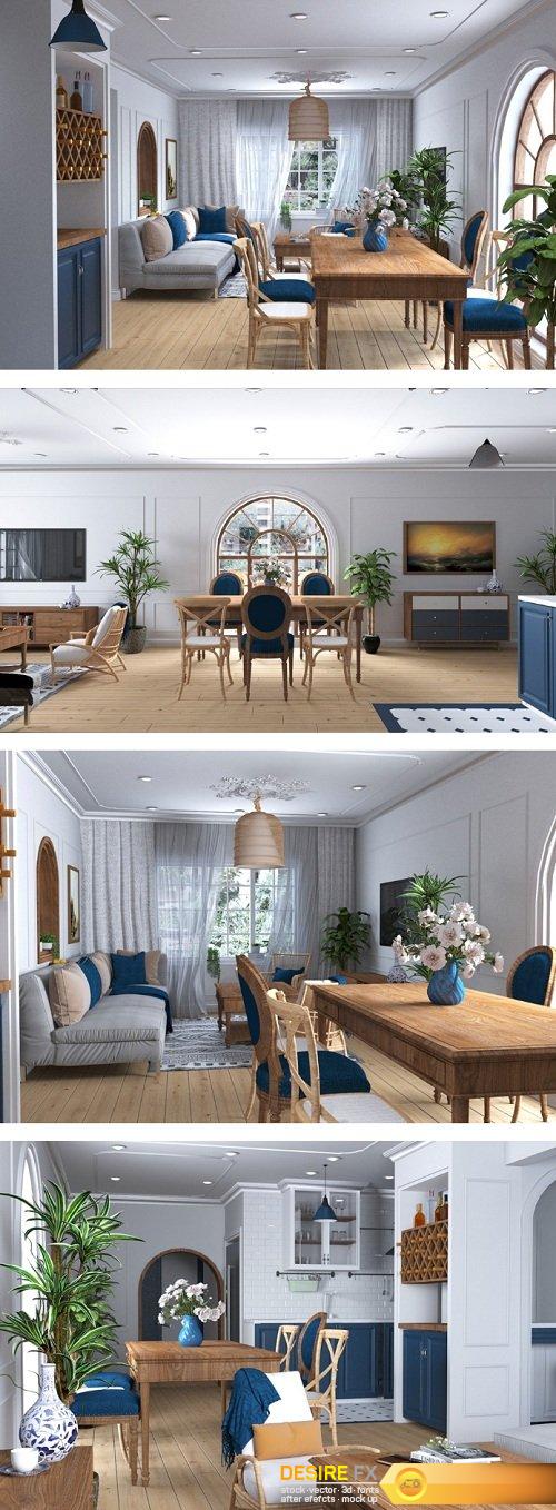 Full Living Room & Kitchen 3d Interior Scene 04